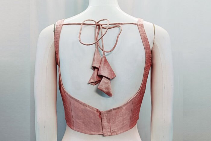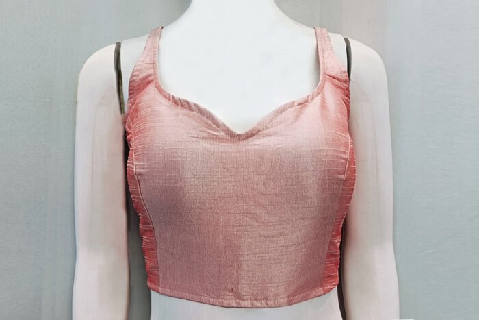 This is a Light Peach Color Raw Silk Blouse. This Blouse is Sweetheart Neckline in Frontside and Backside with Tie-Up. This is a Princess Cut, Padded, Sleeveless Blouse with Back Open. You can team it up with any contrast colored Printed or Traditional Saree.
