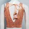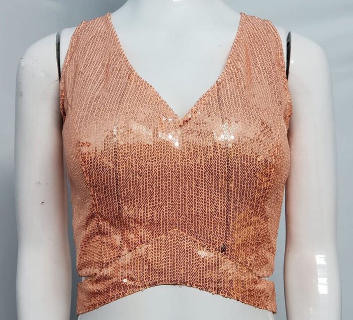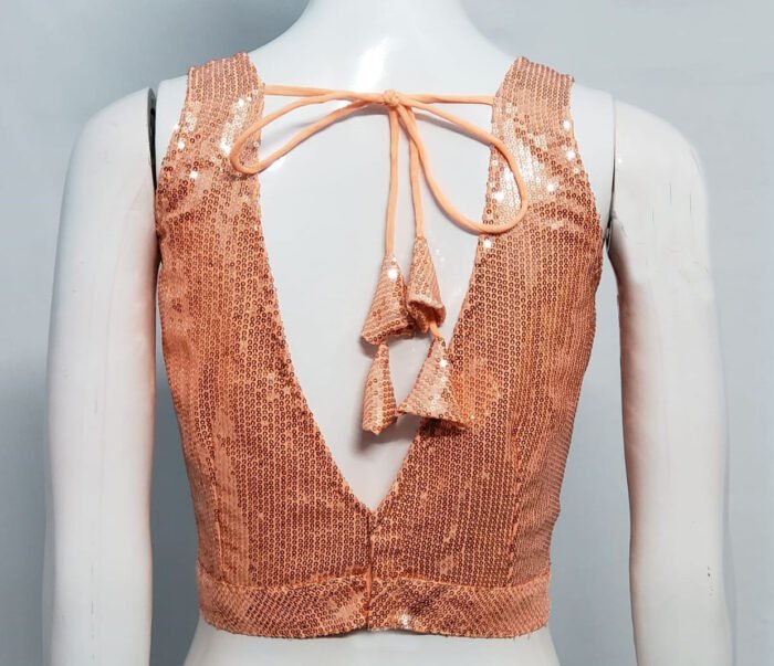 This is a Peach Color Sequin Blouse. This Blouse is V-Neckline in Frontside and Backside with Tie Up. This is a Princess Cut, Padded & Sleeveless Blouse with Back Open. You can team it up with any contrast colored Printed or Traditional Saree.