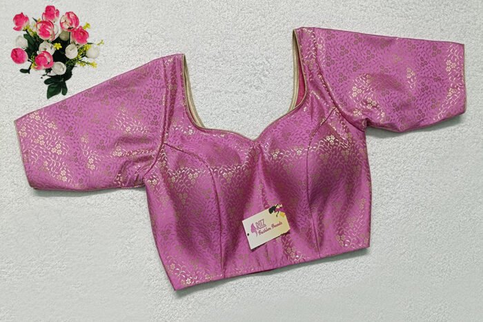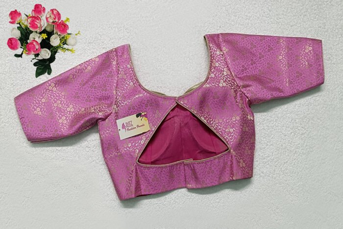 This is a Pink Color Brocade Blouse. This is Sweetheart-Neckline in both Frontside & Key-Hole Neckline in Backside with Tie-Up. This is a Princess Cut, Padded, Glass Sleeve Blouse with Back Open. You can team it up with any contrast-colored Traditional/Printed Saree.