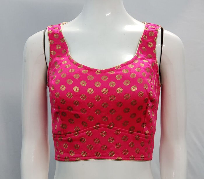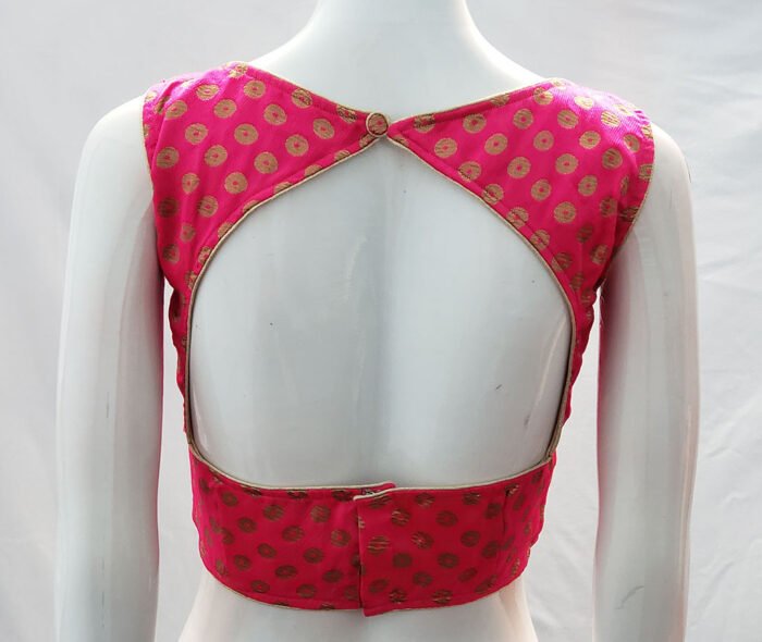 This is a Hot Pink Color Brocade Blouse. This Blouse is U-Neckline in Frontside and Keyhole Neckline in Backside. This is a Princess Cut, Padded, Sleeveless Blouse with Back Open. You can team it up with any contrast colored Printed or Traditional Saree.