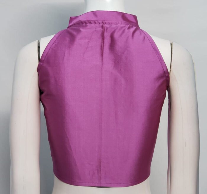This is a Purple Color Samo Silk Blouse. This Blouse is Halter Arrow Neckline in Frontside and High Neckline in Backside with Mandarin Collar. This is a Princess Cut, Padded, Sleeveless Blouse with Front open. You can team it up with any contrast colored Printed or Traditional Saree.