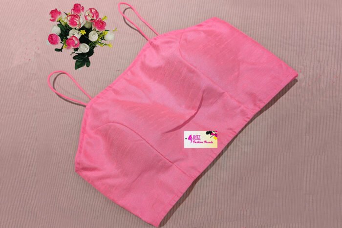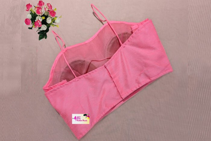 This is a Pink Color Raw Silk Spaghetti. This Blouse is a Single Spaghetti Strap with Band Neckline in Frontside and Round Neckline Backside. This is a Princess Cut Padded Blouse with Back Open. You can team it up with any contrast colored Traditional Saree.