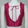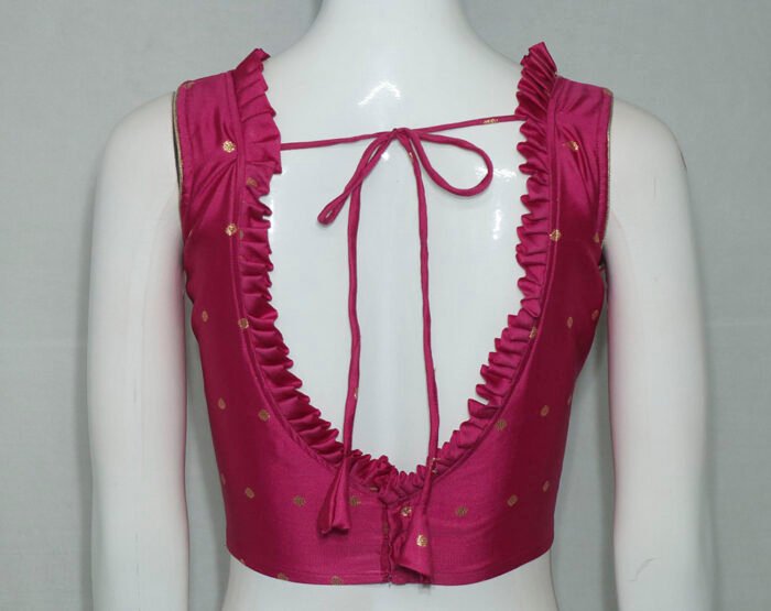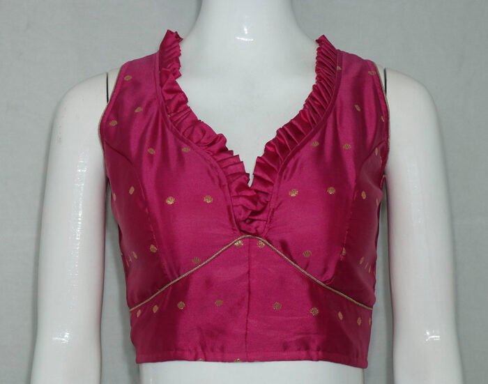 This is a Pink Color Taffeta Silk Blouse With Frill Pleated Work in both Necklines. This Blouse is Sweet Heart Neckline in Frontside and V Neckline in Backside with Tie-Up. This is a Princess Cut Sleeveless Padded Blouse with Back Open. You can team it up with any contrast colored Traditional Saree.