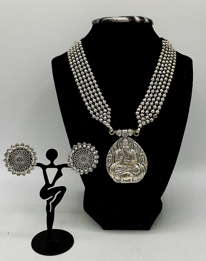 Premium Quality German Silver Multi layer Beads Necklace with Stud Earrings Set. This Trendy Necklace with Round Ganesh Pendant will looks Wonderful with any Types Of Fancy Saree.