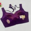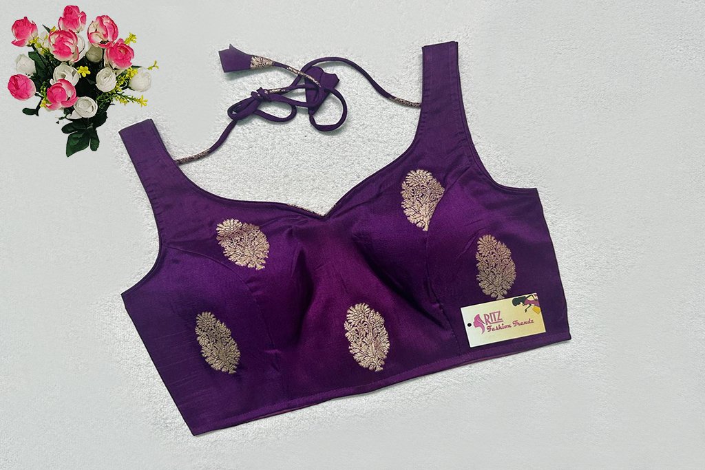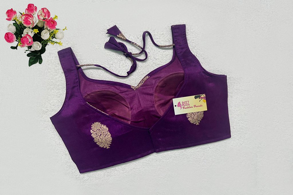 This is a Purple Color Russian Silk Blouse. This is a Sweetheart Neckline Blouse in Frontside & Leaf Neckline in Backside with Tie-Up. This is a Princess Cut, Padded, Sleeveless Blouse with Back Open. You can team it up with any contrast-colored Traditional/Printed Saree.