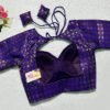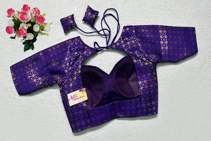 This is a Purple Blue Color Brocade Blouse. This is Semi-Sweetheart Neckline in Frontside & Key-Hole Neckline in Backside with Tie-Up. This is a Princess Cut, Padded, Glass Sleeve Blouse with Back Open. You can team it up with any contrast-colored Traditional/Printed Saree.