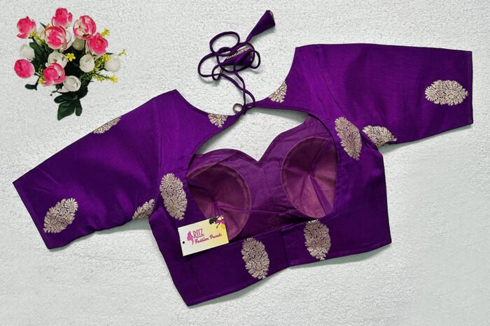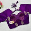 This is a Purple Color Russian Silk Blouse. This is Sweetheart Neckline in Frontside & Keyhole Neckline in Backside with Tie-Up. This is a Princess Cut, Padded, Glass Sleeve Blouse with Back Open. You can team it up with any contrast-colored Traditional/Printed Saree.
