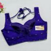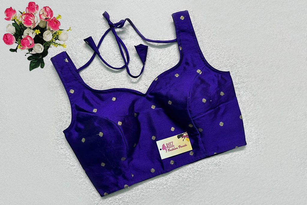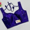 This is a Purple Blue Color Taffeta Silk Blouse. This is a Sweetheart Neckline Blouse in Frontside & U-Neckline in Backside with Tie-Up. This is a Princess Cut, Padded, Sleeveless Blouse with Back Open. You can team it up with any contrast-colored Traditional/Printed Saree.