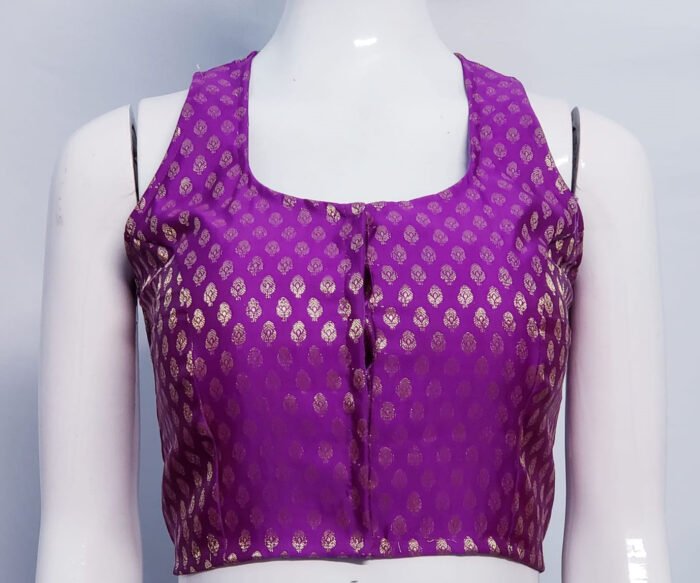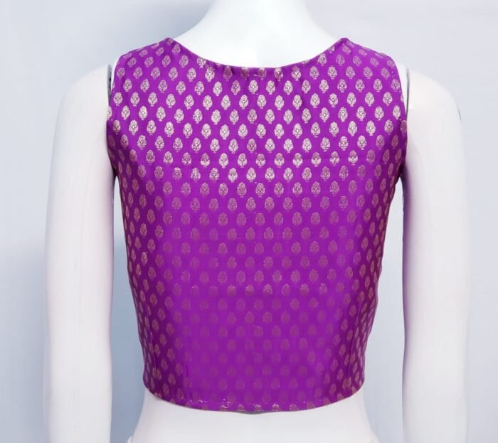 This is a Purple Color Brocade Blouse. This Blouse is Rounded Square Neckline in Frontside and High-Neckline in Backside. This is a Princess Cut, Padded & Sleeveless Blouse with Front Open. You can team it up with any contrast colored Printed or Traditional Saree.