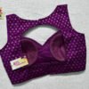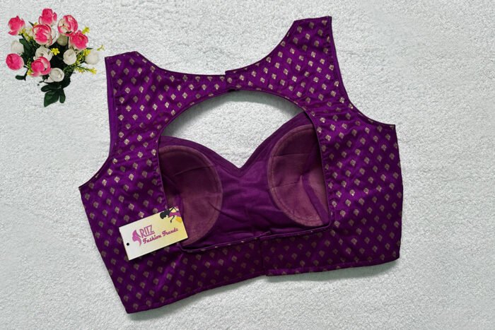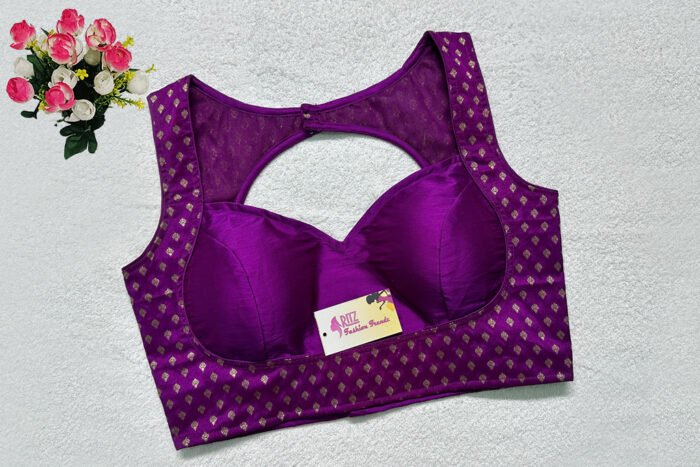 This is a Purple Brocade With Samo Silk Blouse. This Blouse is Sweetheart Neckline in Frontside & Keyhole Neckline in Backside. This is a Princess Cut, Padded, Sleeveless Blouse with Back Open. You can team it up with any contrast-colored Traditional/Printed Saree.
