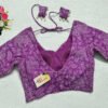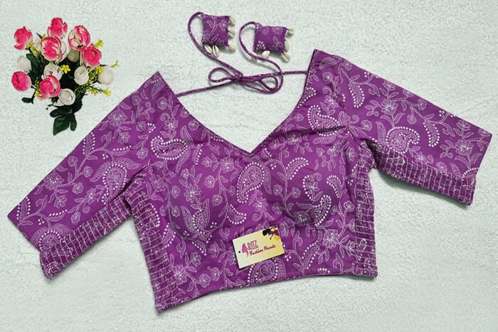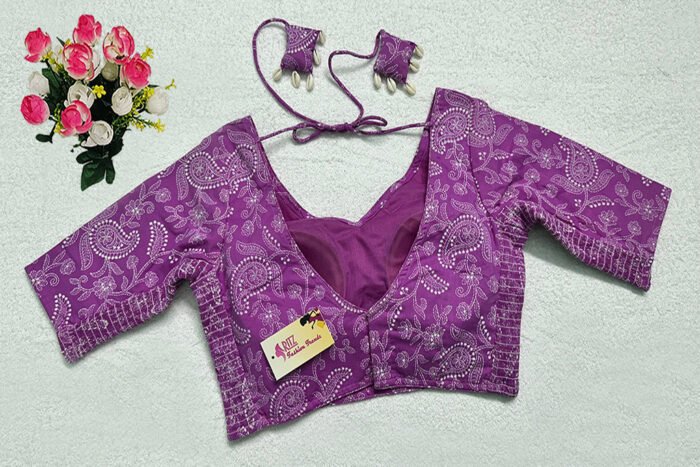 This is a Lavender Color Elastic Ease Blouse. This Blouse is V-Neckline in both Frontside & Backside with Tie-Up. This is a Princess Cut, Padded, Glass Sleeve Blouse with Back Open and Pleated Patch Design in Sleeves. You can team it up with any contrast-colored Traditional/Printed Saree.