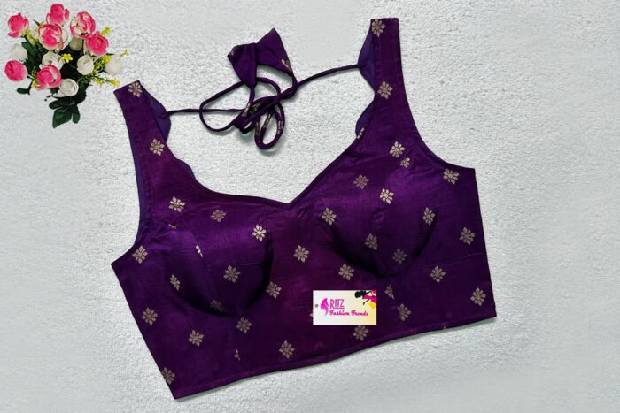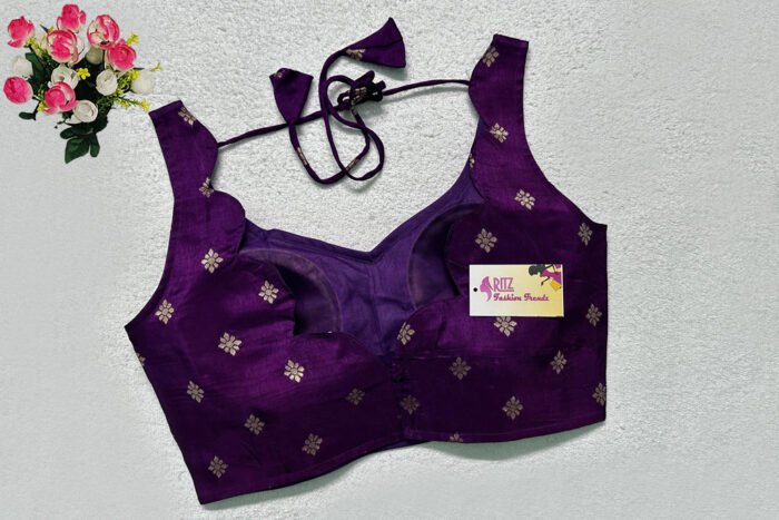 This is a Purple Color Russian Silk Blouse. This is Sweetheart Neckline in both Frontside & Backside with Tie-Up. This is a Princess Cut, Padded, Sleeveless Blouse with Back Open. You can team it up with any contrast-colored Traditional/Printed Saree.