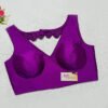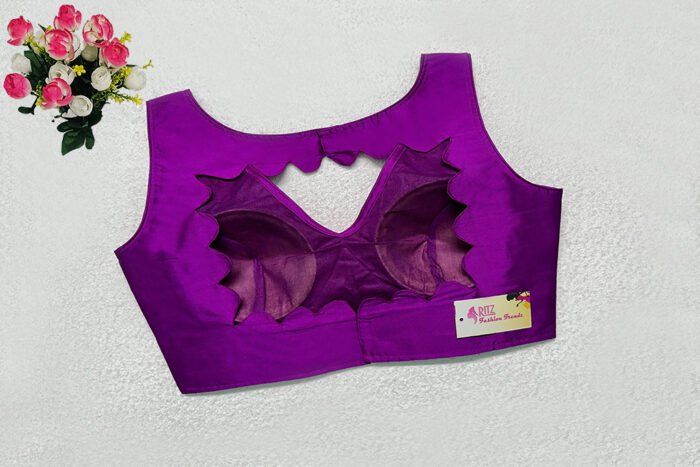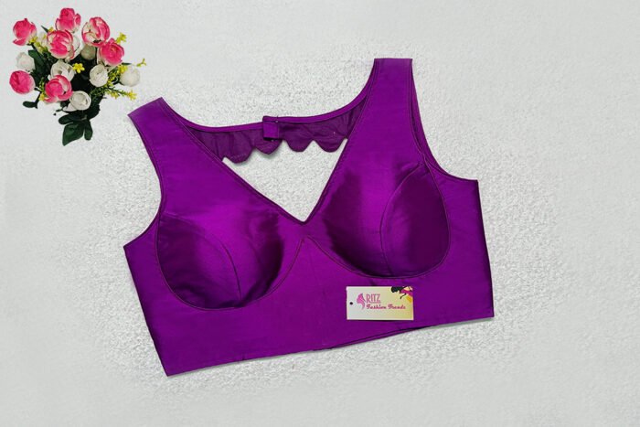 This is a Purple Color Samo Silk Blouse. This is V-Neckline in Frontside & Scallop Keyhole Neckline in Backside. This is a Princess Cut, Padded, Sleeveless Blouse with Back Open. You can team it up with any contrast-colored Traditional/Printed Saree.