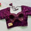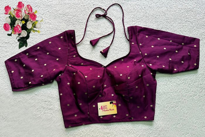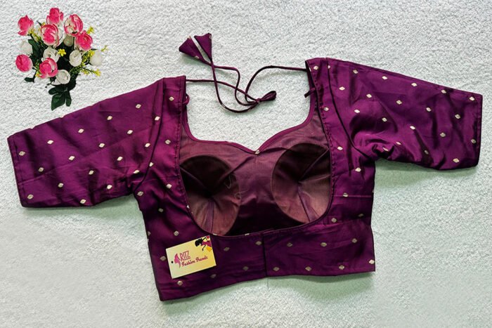 This is a Purple Color Taffeta Silk Blouse. This Blouse is Sweetheart-Neckline in Frontside & U-Neckline in Backside with Tie-Up. This is a Princess Cut, Padded, Glass Sleeve Blouse with Back Open. You can team it up with any contrast-colored Traditional/Printed Saree.