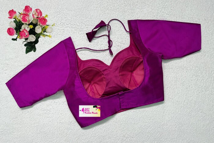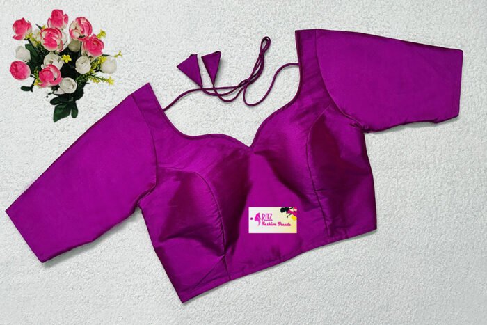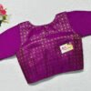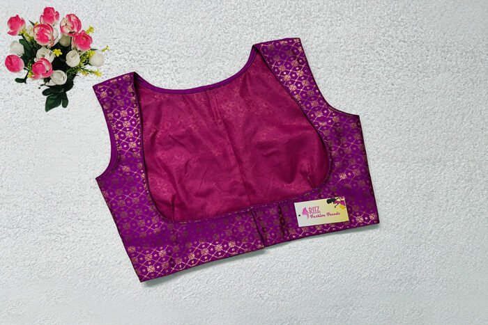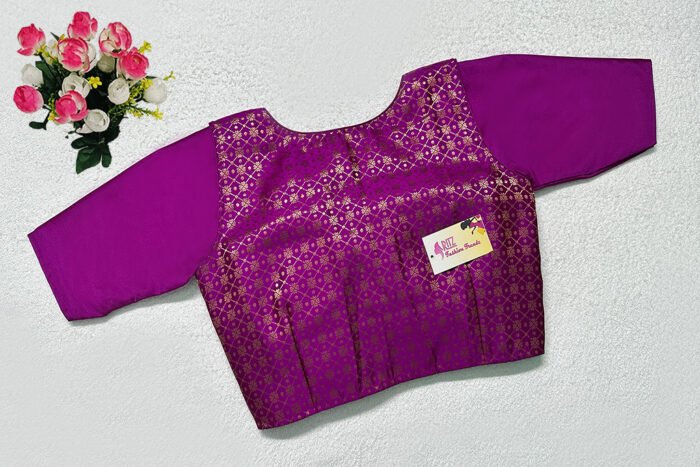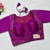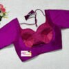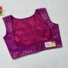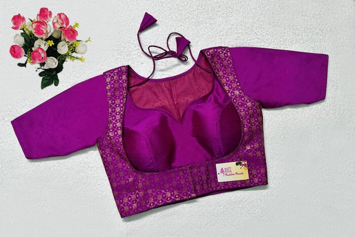 This is a Purple Color Samo Silk With Brocade Jacket Blouse. This is Sweet Heart Neckline in Frontside & Boat Neckline in Backside with Tie-Up. This is a Princess Cut, Padded, Glass Sleeve Blouse with Front Open. You can team it up with any contrast-colored Traditional/Printed Saree.