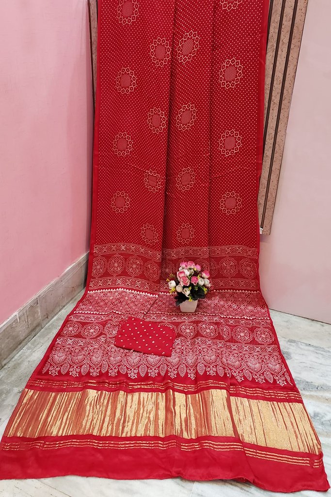 Red Color Ajrakh Printed Gajji Silk Saree.