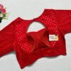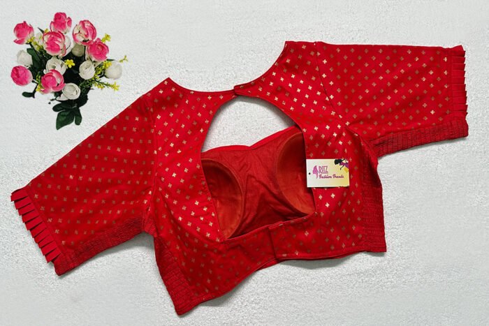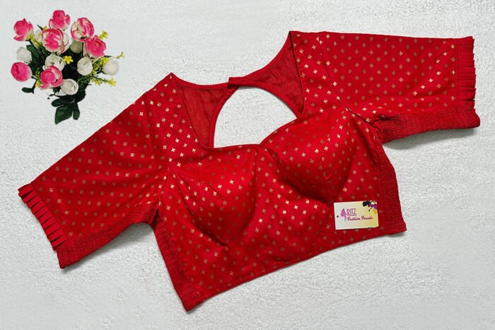 This is a Red Color Brocade Elastic Ease Blouse. This is Sweetheart Neckline in Frontside & Keyhole Neckline in Backside. This is a Princess Cut, Padded, Glass Sleeve Blouse with Back Open. You can team it up with any contrast-colored Traditional/Printed Saree.
