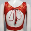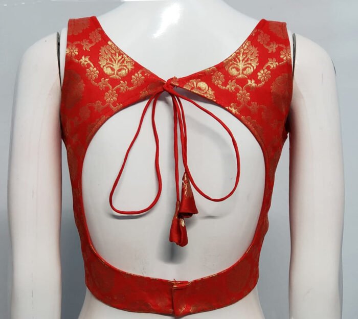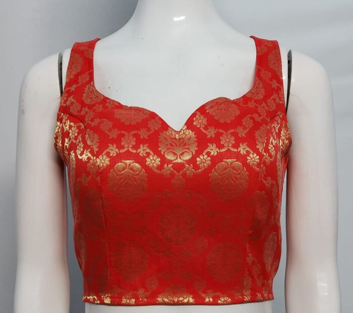This is a Red Color Brocade Benarasi Blouse. This Blouse is Sweetheart Neckline in Frontside and Keyhole Neckline in Backside with Tie Up. This is a Princess Cut, Padded & Sleeveless Blouse with Back Open. You can team it up with any contrast colored Printed or Traditional Saree.