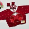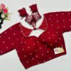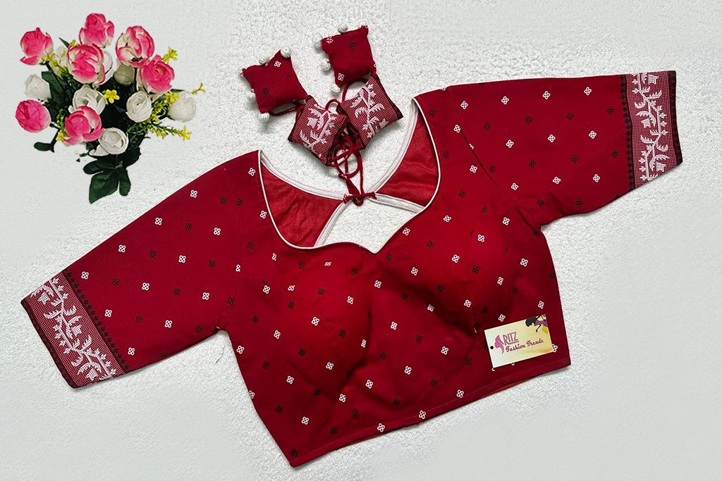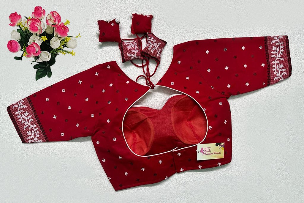 This is a Red Color Cotton Printed Blouse. This is a Sweetheart Neckline Blouse in Frontside & Keyhole Neckline in Backside with Tie-Up. This is a Princess Cut, Padded, Glass Sleeve Blouse with Back Open. You can team it up with any contrast-colored Traditional/Printed Saree.