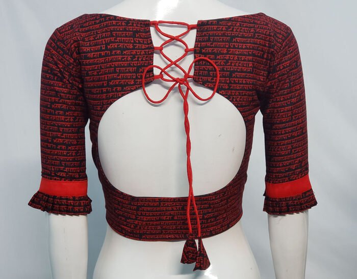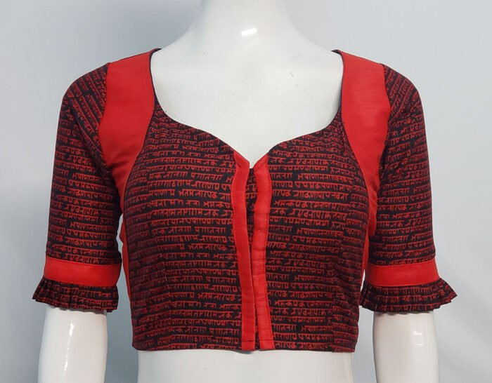 This is a Black & Red Color Manuscript Cotton Blouse. This Blouse has Sweetheart Neckline in Frontside and Key Hole Neckline in Backside with Crisscross Tie up. This is a Princess Cut Padded Glass Sleeve Blouse with Front Open. You can team it up with any contrast colored Printed or Traditional Saree.