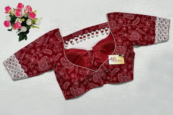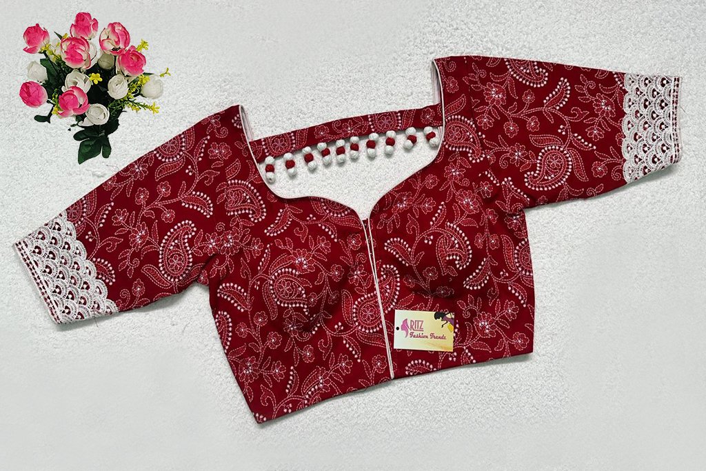 This is a Red Color Cotton Printed Blouse. This is a Sweetheart Neckline Blouse in both Frontside & Backside with a Band. This is a Princess Cut, Padded, Glass Sleeve Blouse with Front Open. You can team it up with any contrast-colored Traditional/Printed Saree.