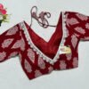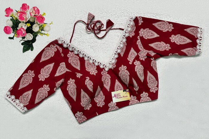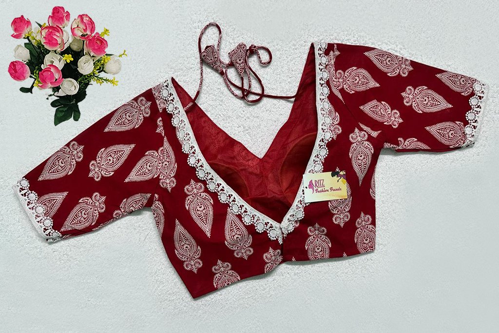 This is a Red Color Cotton Printed Blouse. This is a V-Neckline Blouse in both Frontside & Backside with Tie-Up. This is a Princess Cut, Padded, Glass Sleeve Blouse with Back Open. You can team it up with any contrast-colored Traditional/Printed Saree.