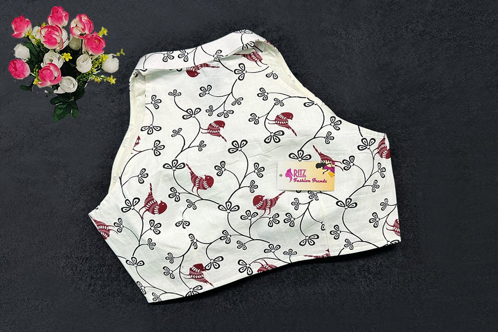 This is a White Color Cotton Printed Blouse. This is a Halter Neckline Blouse in Frontside & High Neckline in Backside with Mandarin Collar. This is a Princess Cut, Padded, Sleeveless Blouse with Front Open. You can team it up with any contrast-colored Traditional/Printed Saree.