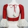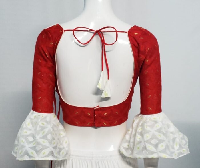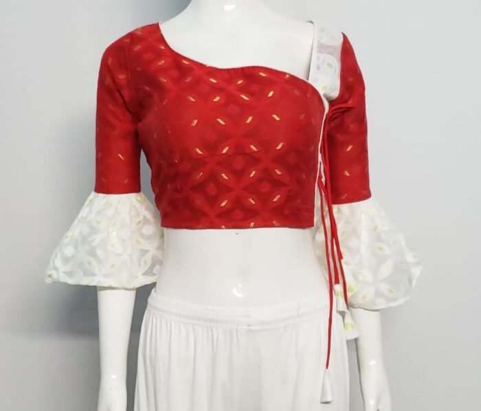 This is a Red & White Color Jamdani Blouse. This Blouse is Sweet Heart Neckline in Frontside and Square Neckline in Backside with Tie Up. This is a Princess Cut, Padded & Ruffle Sleeve Blouse with Back Open. You can team it up with any contrast colored Printed or Traditional Saree.