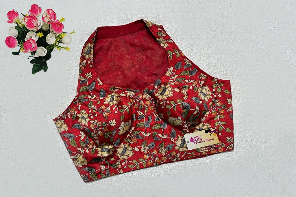 This is a Red Multi Color Litchi Silk Blouse. This is a Halter Neckline Blouse in Frontside & High Neckline in Backside. This is a Princess Cut, Padded, Sleeveless Blouse with Front Open. You can team it up with any contrast-colored Traditional/Printed Saree.