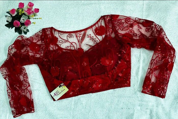 This is a Red Color Embroidered Net Blouse. It is Sweetheart Neckline in Frontside and Illusion Boat Neckline in Backside. This is a Princess Cut Padded Blouse. This Blouse is Full Sleeve and Front Open. You can team it up with any contrast colored Printed/Traditional Saree.