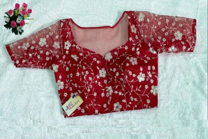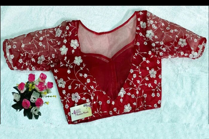 This is a Red Color Embroidered Organza Blouse. It is Sweetheart Neckline in Frontside and Illusion Boat Neckline in Backside. This is a Princess Cut Padded Blouse. This Blouse is Glass Sleeve and Front Open. You can team it up with any contrast colored Printed/Traditional Saree.