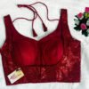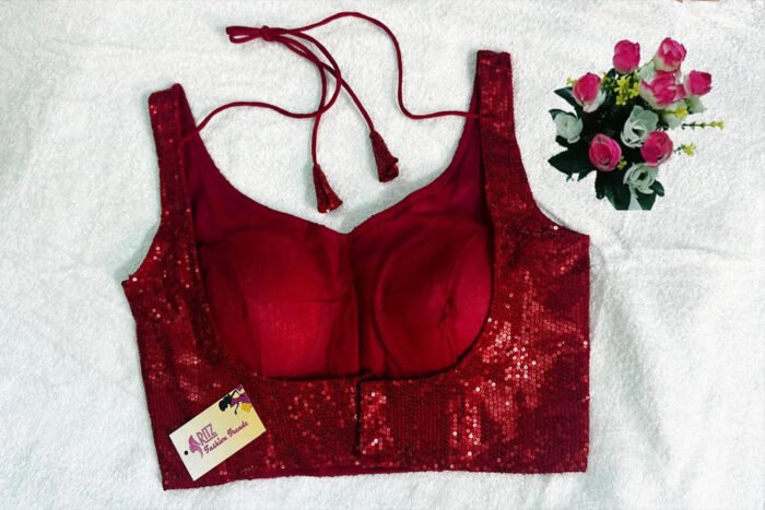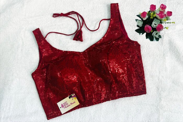 This is a Red Color Sequin Blouse. It is Leaf Neckline in Frontside and U-Neckline in Backside. This is a Princess Cut Padded Blouse. This Blouse is Sleeveless and Back Open. You can team it up with any contrast colored Printed/Traditional Saree.