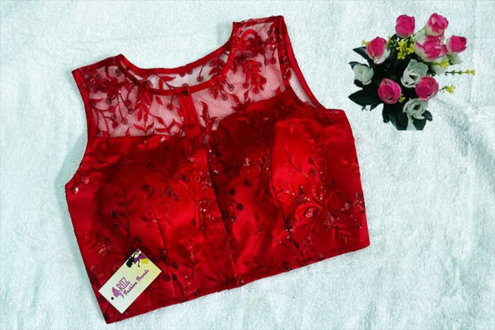 This is a Red Color Net Embroidered Blouse. It is Illusion Boat Neckline in Frontside and Backside. This is a Princess Cut Padded Blouse. This Blouse is Sleeveless and Front Open. You can team it up with any contrast colored Printed/Traditional Saree.