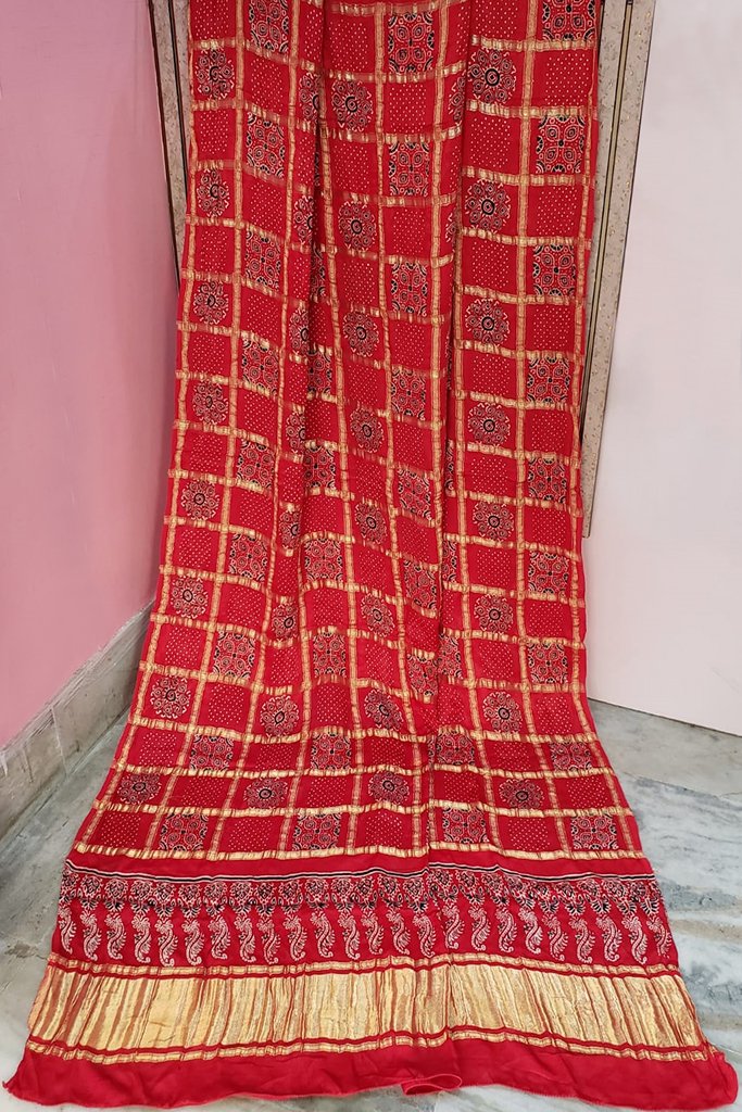 Red Color Ajrakh Printed Gajji Silk Dupatta.