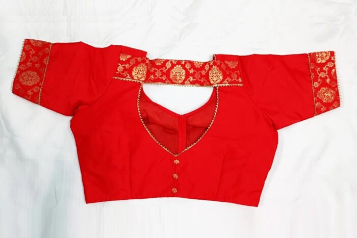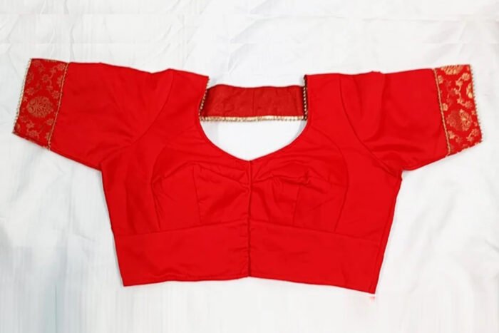 This is a Red Color Rayon Blouse. This Blouse is V-Neckline in Frontside & Backside with a Band. This is a Choli Cut, Non-Padded, Glass Sleeve Blouse with Front Open. You can team it up with any contrast-colored Traditional/Printed Saree.