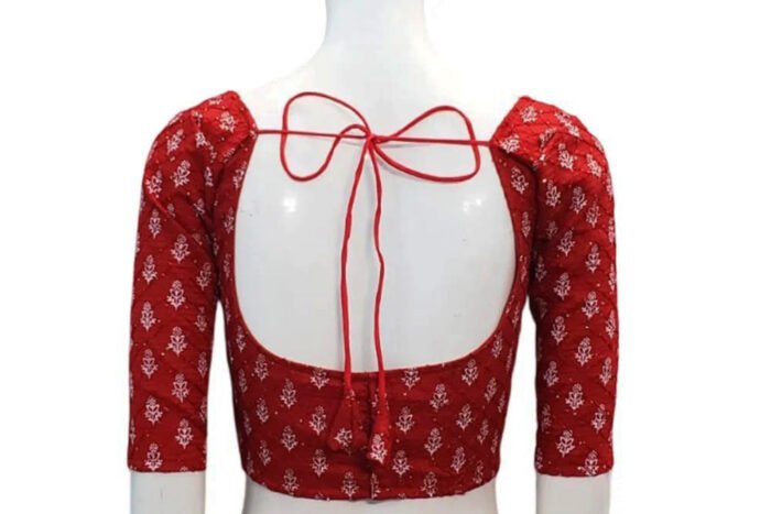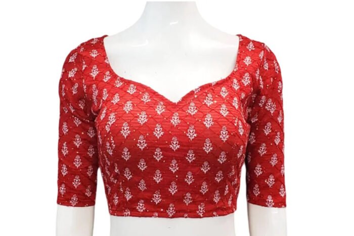This is a Red Color Rayon Printed Blouse. This Blouse is Sweet Heart Neckline in Frontside & U-Neckline in Backside with Tie-Up. This is a Princess Cut, Padded, Glass Sleeve Blouse with Back Open. You can team it up with any contrast-colored Traditional/Fancy Saree.