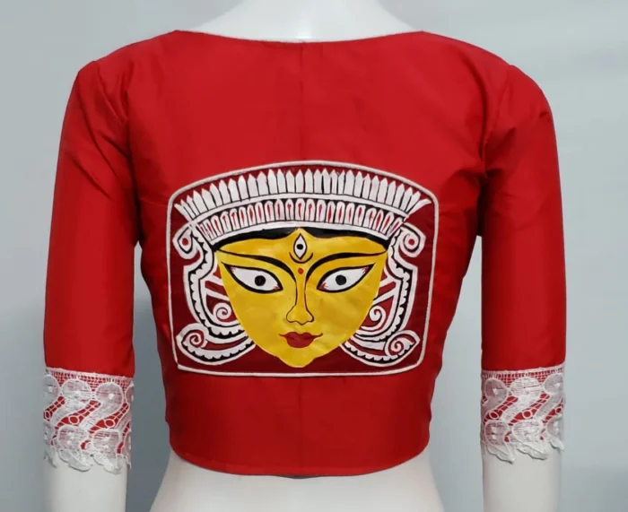 This is a Candy Red Color Cotton Hand-Painted Blouse. This Blouse is V-Neckline in Frontside and Boat Neckline in Backside with Hand-Painting. This is a Choli-Cut, Non-Padded & Glass Sleeve Blouse with Front Open. You can team it up with any contrast colored Printed or Traditional Saree.