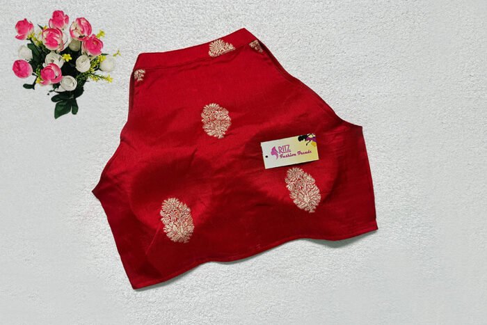 This is a Red Color Russian Silk Blouse. This is V-Slit Halter Neckline in Frontside & High Neckline in Backside with Mandarin Collar. This is a Princess Cut, Padded, Sleeveless Blouse with Front Open. You can team it up with any contrast-colored Traditional/Printed Saree.