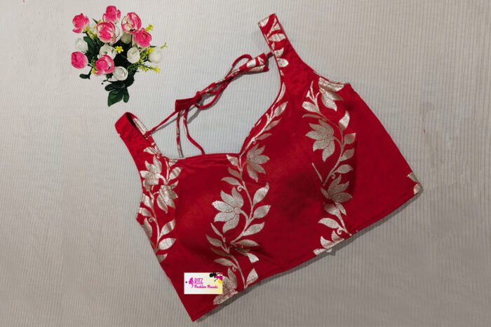 This is a Red Color Russian Silk Blouse. It is Sweetheart Neckline in Frontside & U-Neckline in Backside with Tie-Up. This is a Princess Cut, Padded, Sleeveless Blouse with Back Open. You can team it up with any contrast colored Printed/Traditional Saree.