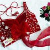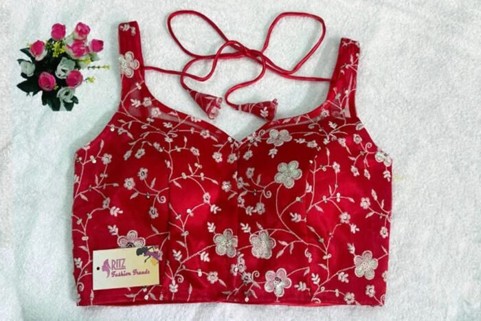 This is a Red Color Embroidered Organza Blouse. It is Sweetheart Neckline in Frontside and V-Neckline in Backside with Tie-Up & a Bow. This is a Princess Cut Padded Blouse. This Blouse is Sleeveless and Back Open. You can team it up with any contrast colored Printed/Traditional Saree.