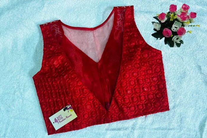 This is a Red Color Net Embroidered Blouse. It is V-Neckline in Frontside and Illusion V-Neckline in Backside. This is a Princess Cut Padded Blouse. This Blouse is Sleeveless and Back Open. You can team it up with any contrast colored Printed/Traditional Saree.