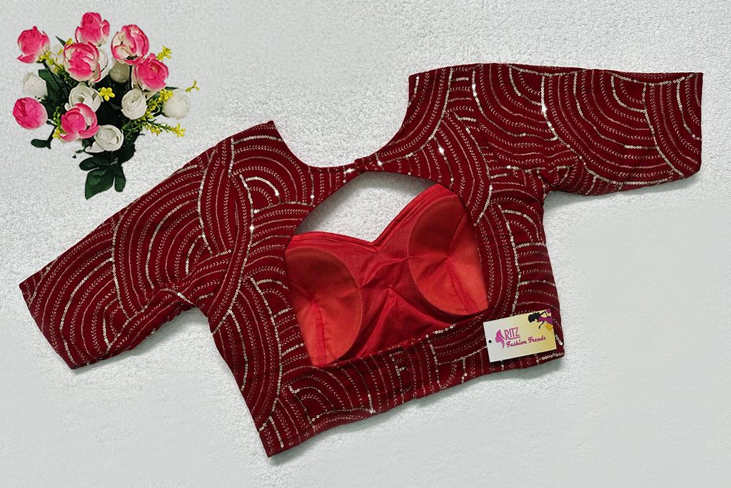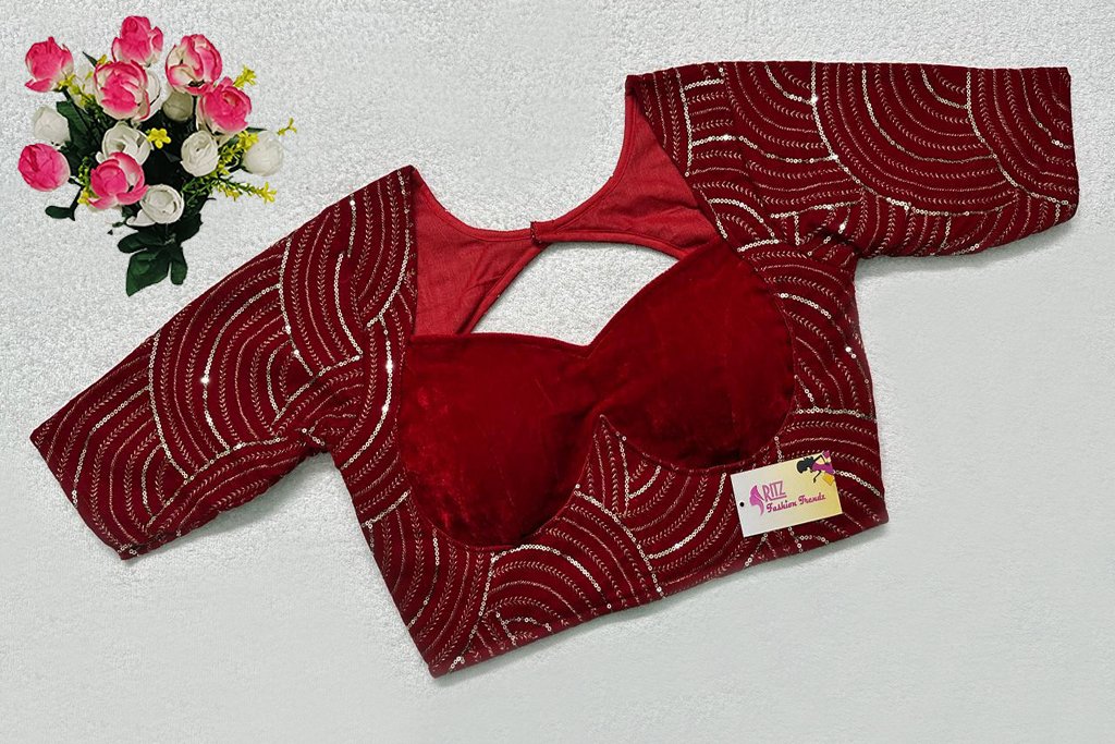 This is a Red Color Velvet Embroidered Blouse. This is Sweetheart Neckline in Frontside & Keyhole Neckline in Backside. This is a Princess Cut, Padded, Glass Sleeve Blouse with Back Open. You can team it up with any contrast-colored Traditional/Printed Saree.