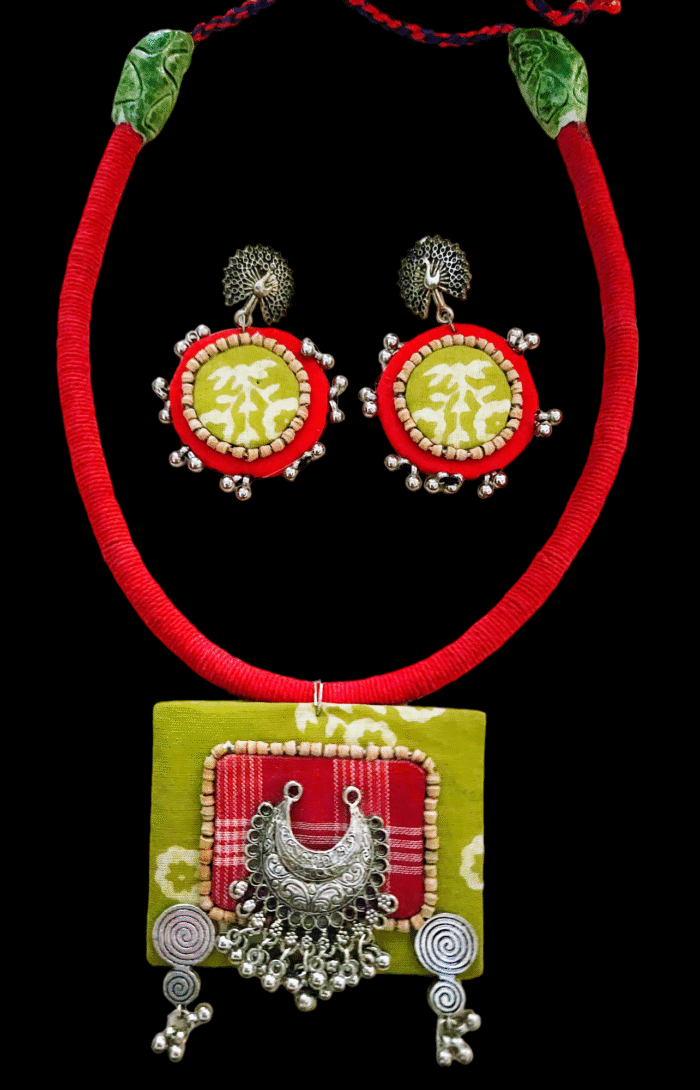 Red & Green Color Hand Crafted Necklace Set With Beads.