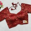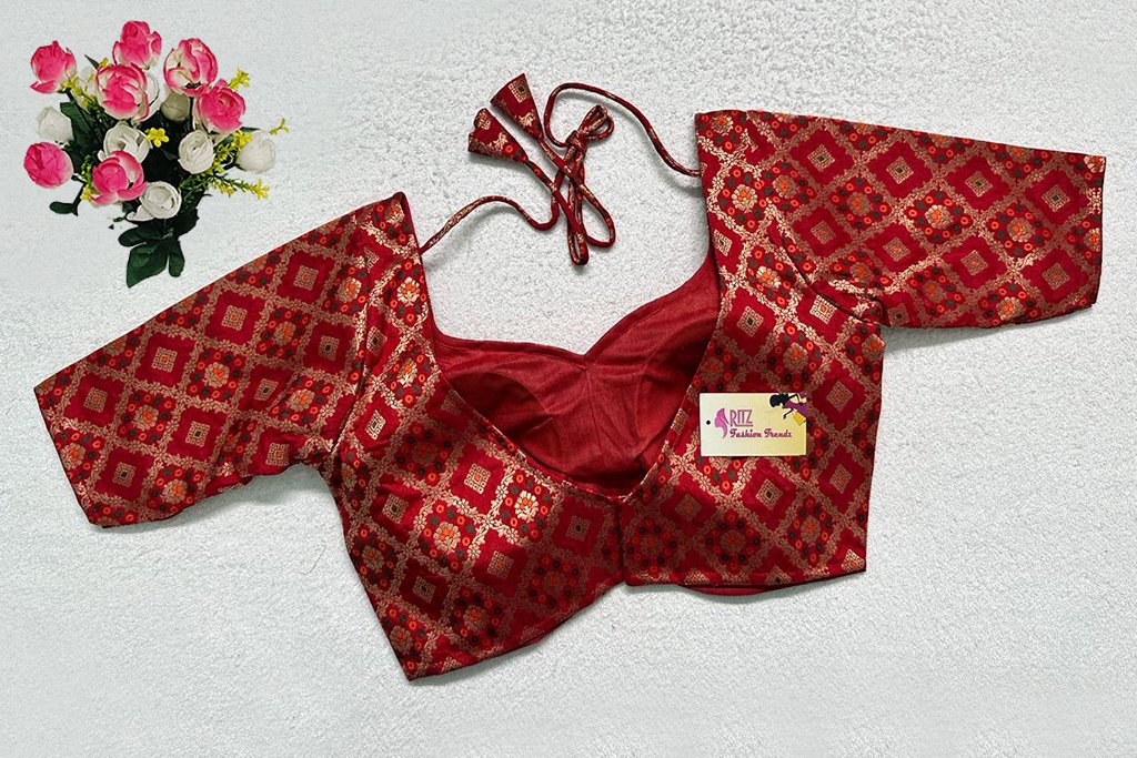 This is a Red Meena Kari Brocade Blouse. This is a Sweetheart Neckline Blouse in Frontside & Leaf Neckline in Backside with Tie-Up. This is a Princess Cut, Padded, Glass Sleeve Blouse with Back Open. You can team it up with any contrast-colored Traditional/Printed Saree.