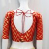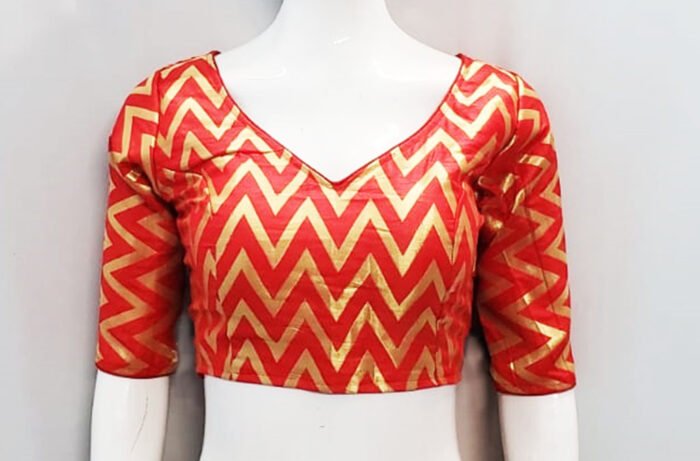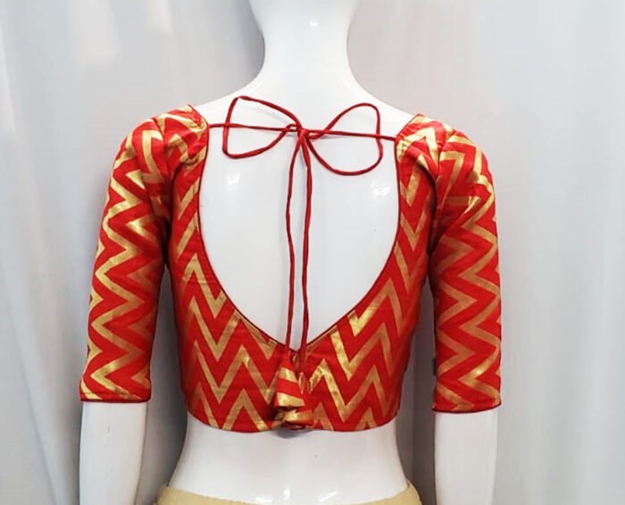 This is a Red Color Brocade Blouse. This Blouse is Leaf Neckline in Frontside & Backside with Tie-Up. This is a Princess Cut, Padded, Glass Sleeve Blouse with Back Open. You can team it up with any contrast-colored Traditional/Fancy Saree.