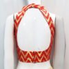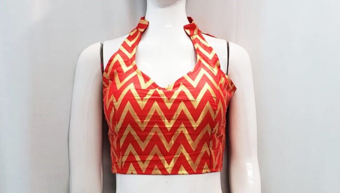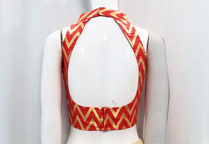 This is a Red Color Brocade Blouse. This Blouse is Halter Arrow Neckline in both Frontside & Backside with Mandarin Collar. This is a Princess Cut, Padded, Sleeveless Blouse with Back Open. You can team it up with any contrast-colored Traditional/Fancy Saree.