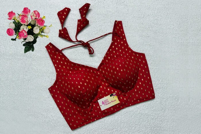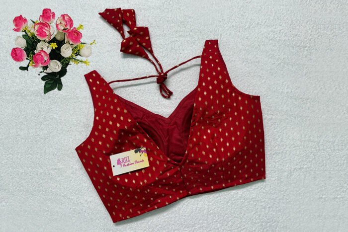 This is a Red Color Meenakari Chanderi Silk Blouse. This Blouse is V-Neckline in both Frontside & Backside with Tie-Up. This is a Princess Cut, Padded, Sleeveless Blouse with Back Open. You can team it up with any contrast-colored Traditional/Printed Saree.