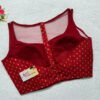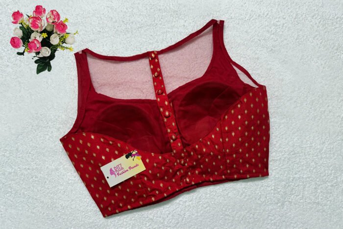 This is a Red Color Chanderi Silk Blouse. This Blouse is Sweetheart Neckline in Frontside & Illusion Boat Neckline in Backside. This is a Princess Cut, Padded, Sleeveless Blouse with Front Open. You can team it up with any contrast-colored Traditional/Printed Saree.