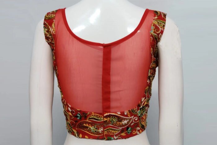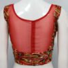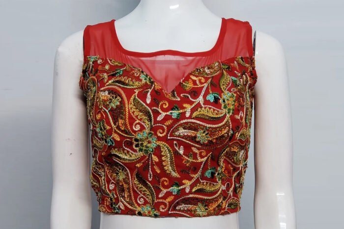 This is a Red Multi Color Georgette Embroidered Blouse. This Blouse is Illusion Neckline in Frontside and Backside. This is a Princess Cut, Padded & Sleeveless Blouse with Back Open. You can team it up with any contrast colored Printed or Traditional Saree.