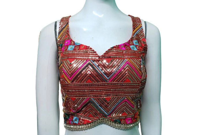 This is a Red Multi Color Georgette Heavy Embroidered Blouse. This Blouse is Sweet-Heart Neckline in Frontside and U-Neckline in Backside with Tie-Up. This is a Princess Cut, Padded, Sleeveless Blouse with Back Open. You can team it up with any contrast colored Printed or Traditional Saree.